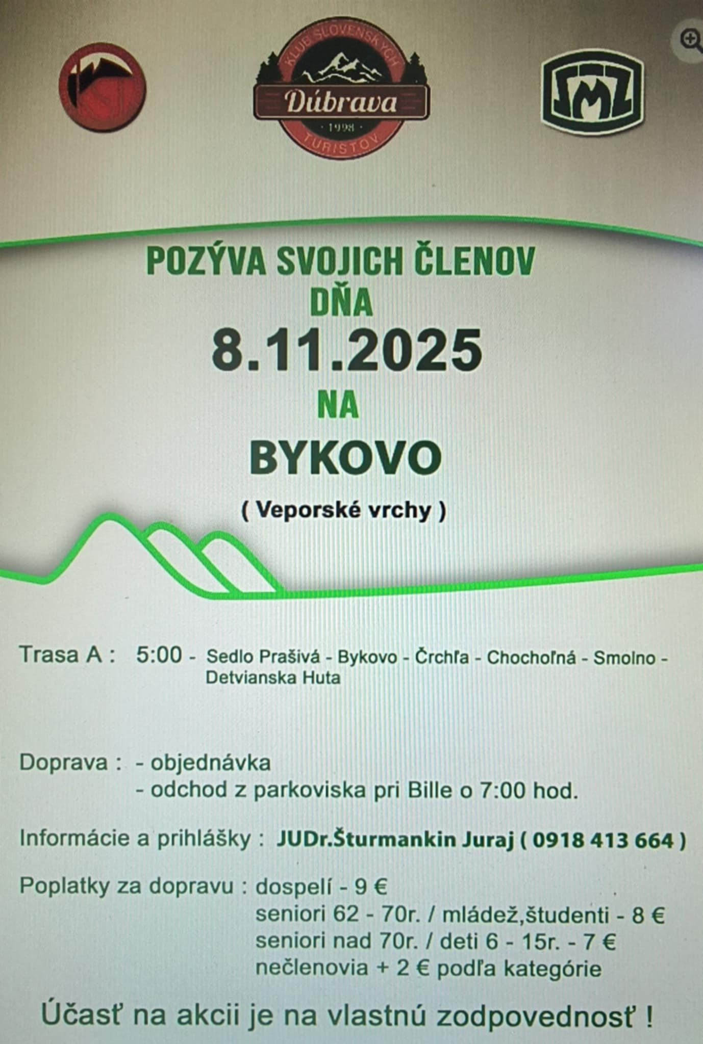 Spôsob dopravy na akciu: autobus, v prípade aspoň 30prihlásených